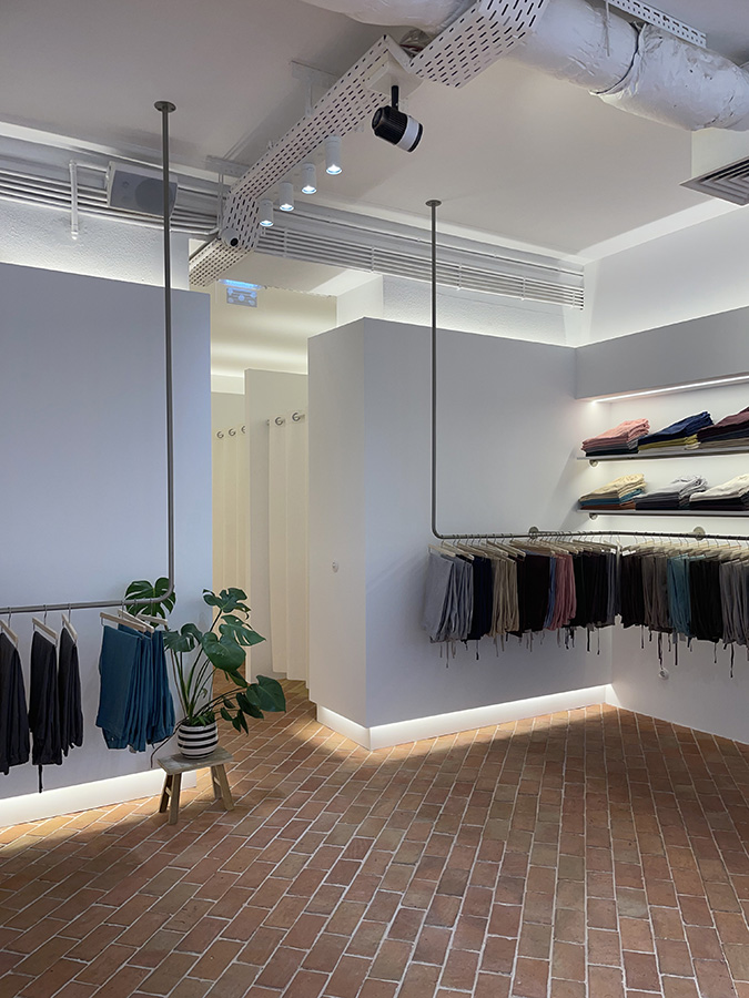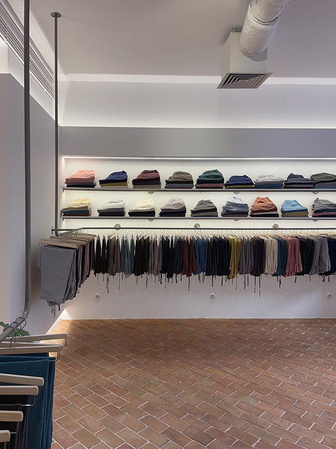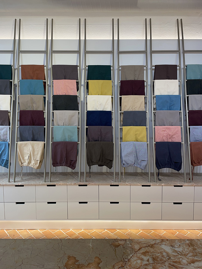 O nome refere-se às calças tradicionais dos agricultores japoneses, expostas ao seu estilo minimalista, e a reminiscência desta rusticidade influencia a escolha dos materiais tipicamente portugueses para revestimento da loja.