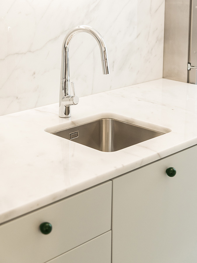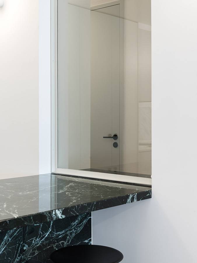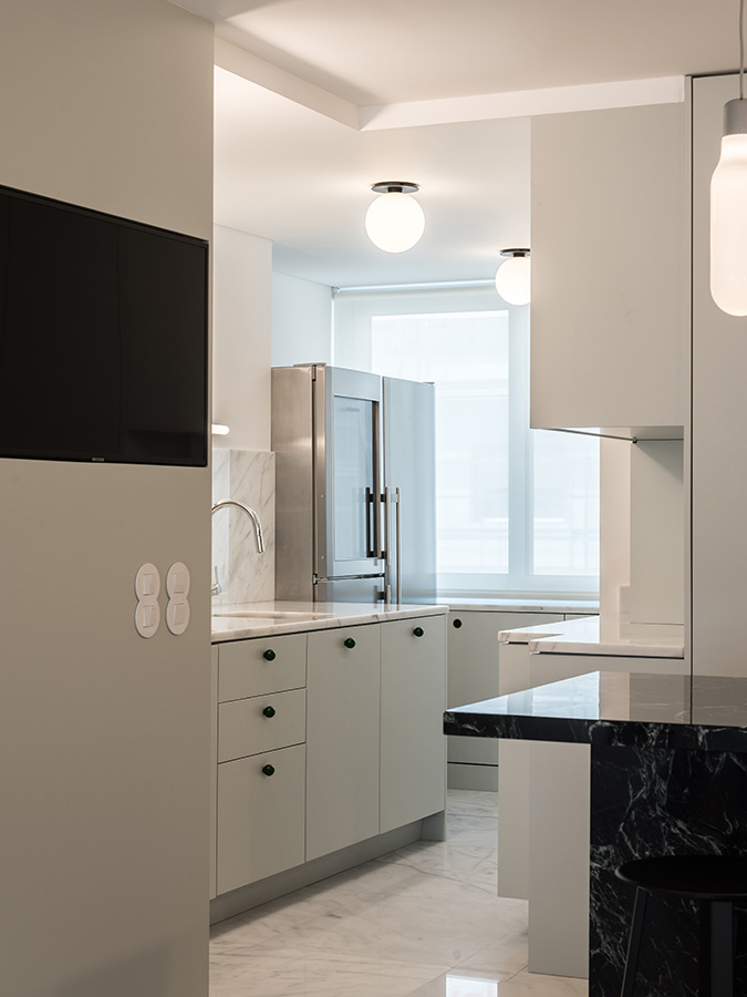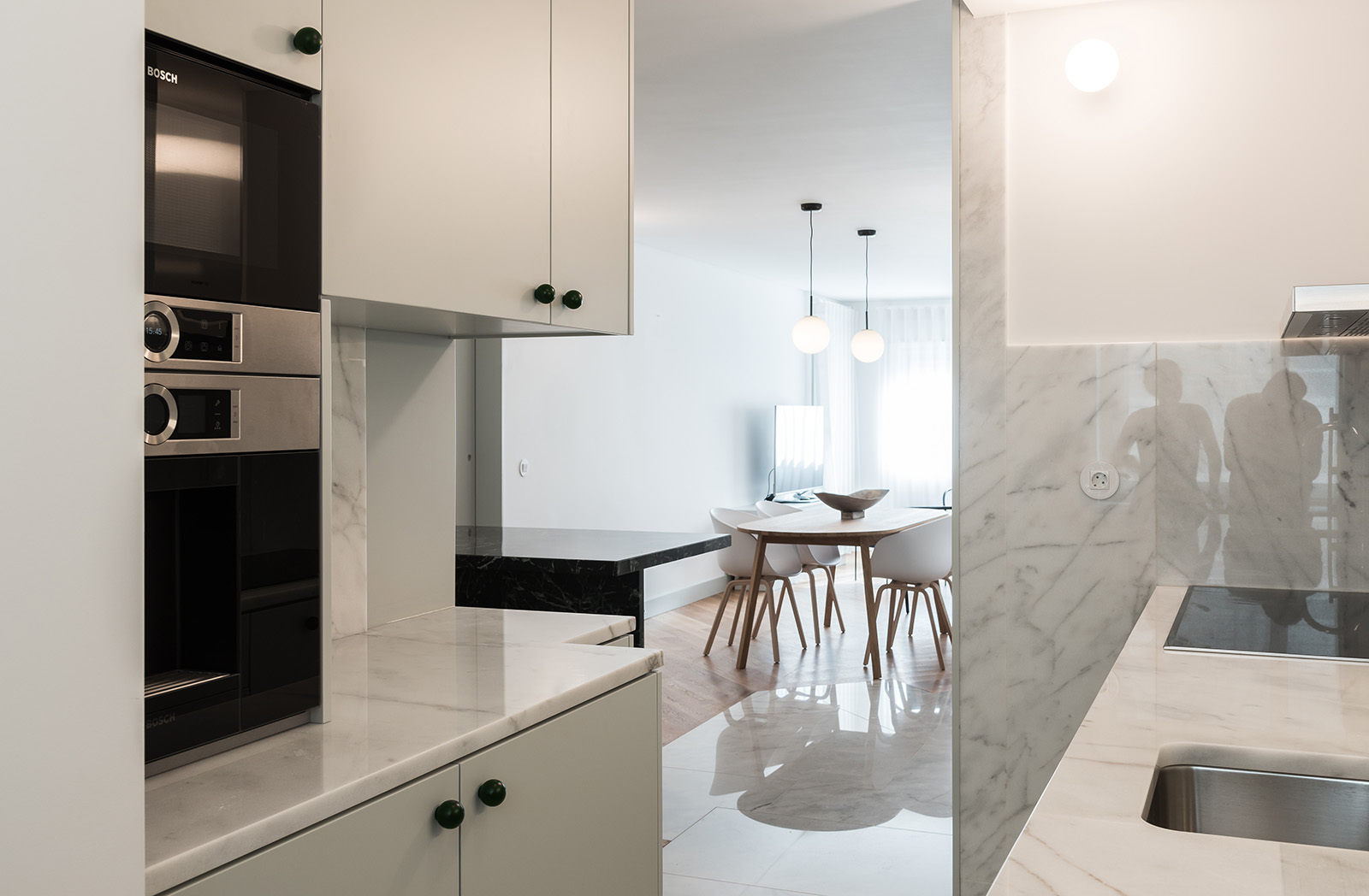 Os tons verde-água relembram que estamos perto de um mar frio e a ilha central, como rótula que une e relaciona o privado e o social da casa, garante o conforto do espaço de convívio.
