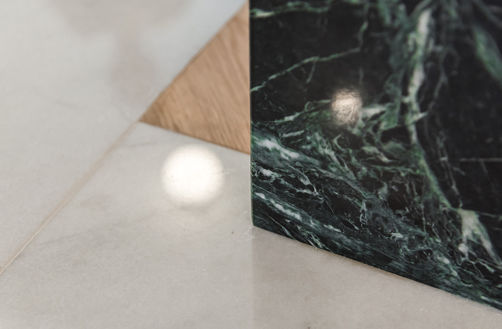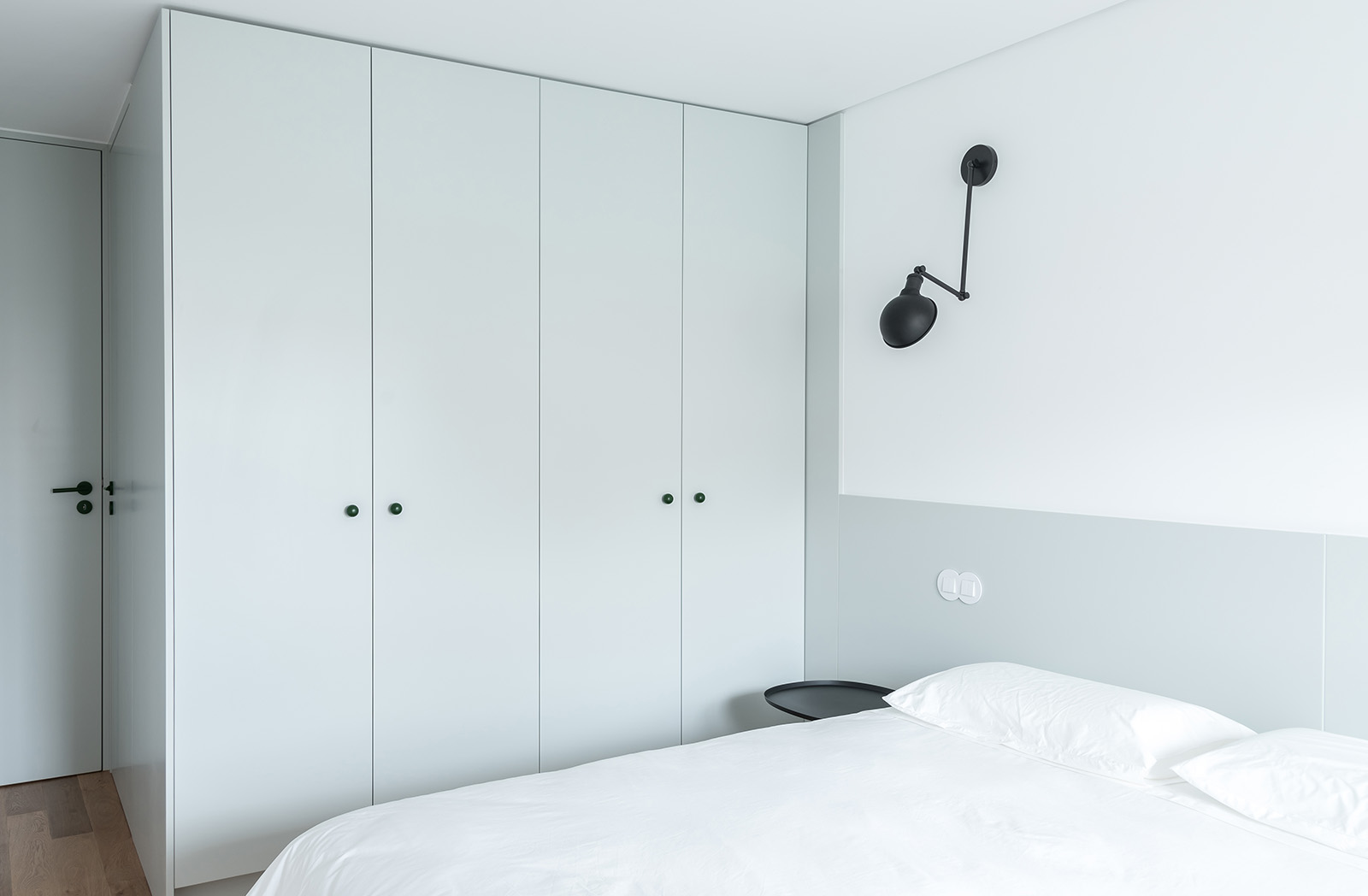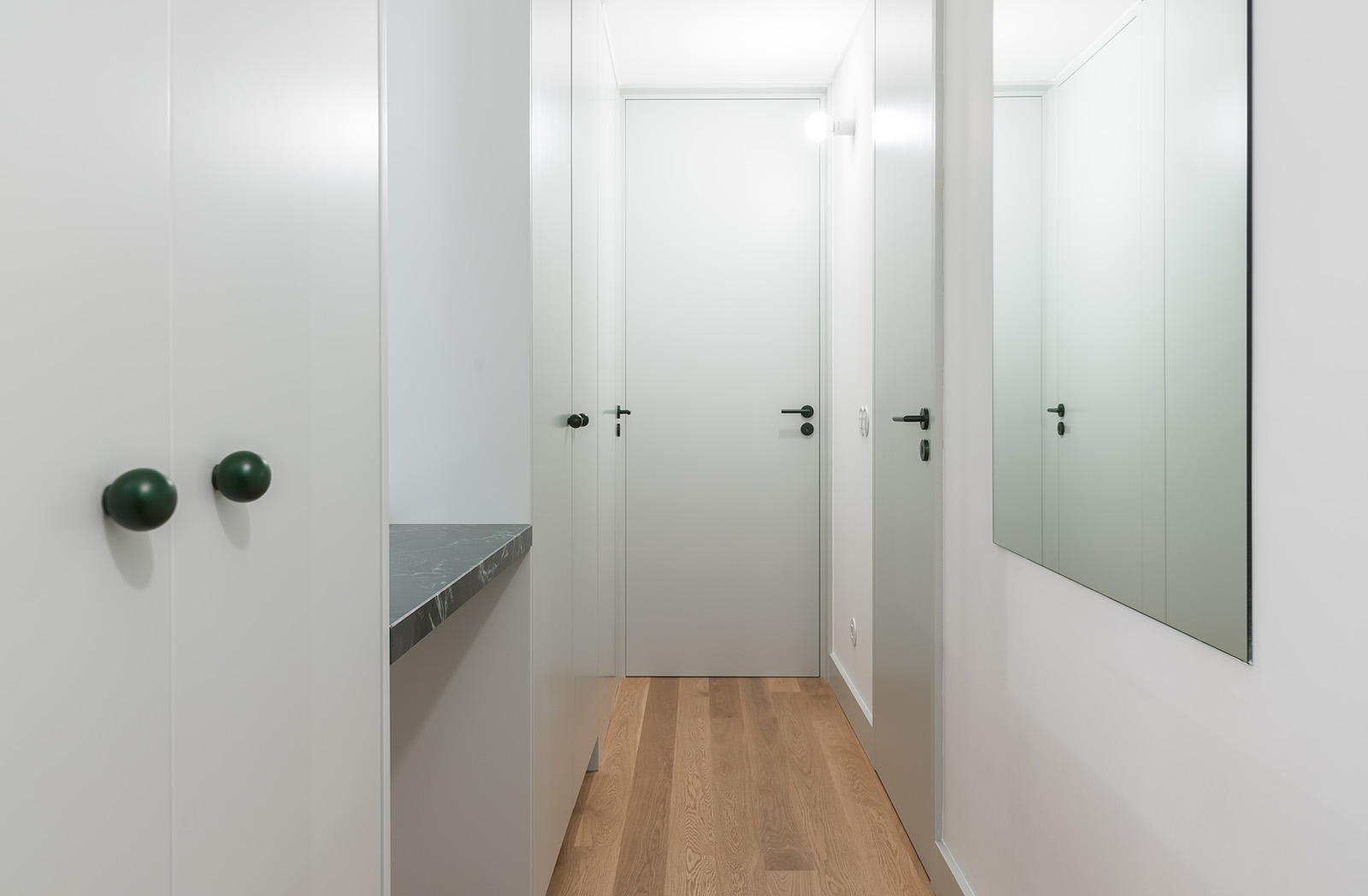 Os tons verde-água relembram que estamos perto de um mar frio e a ilha central, como rótula que une e relaciona o privado e o social da casa, garante o conforto do espaço de convívio.