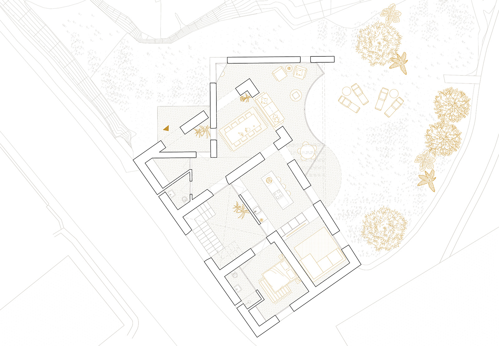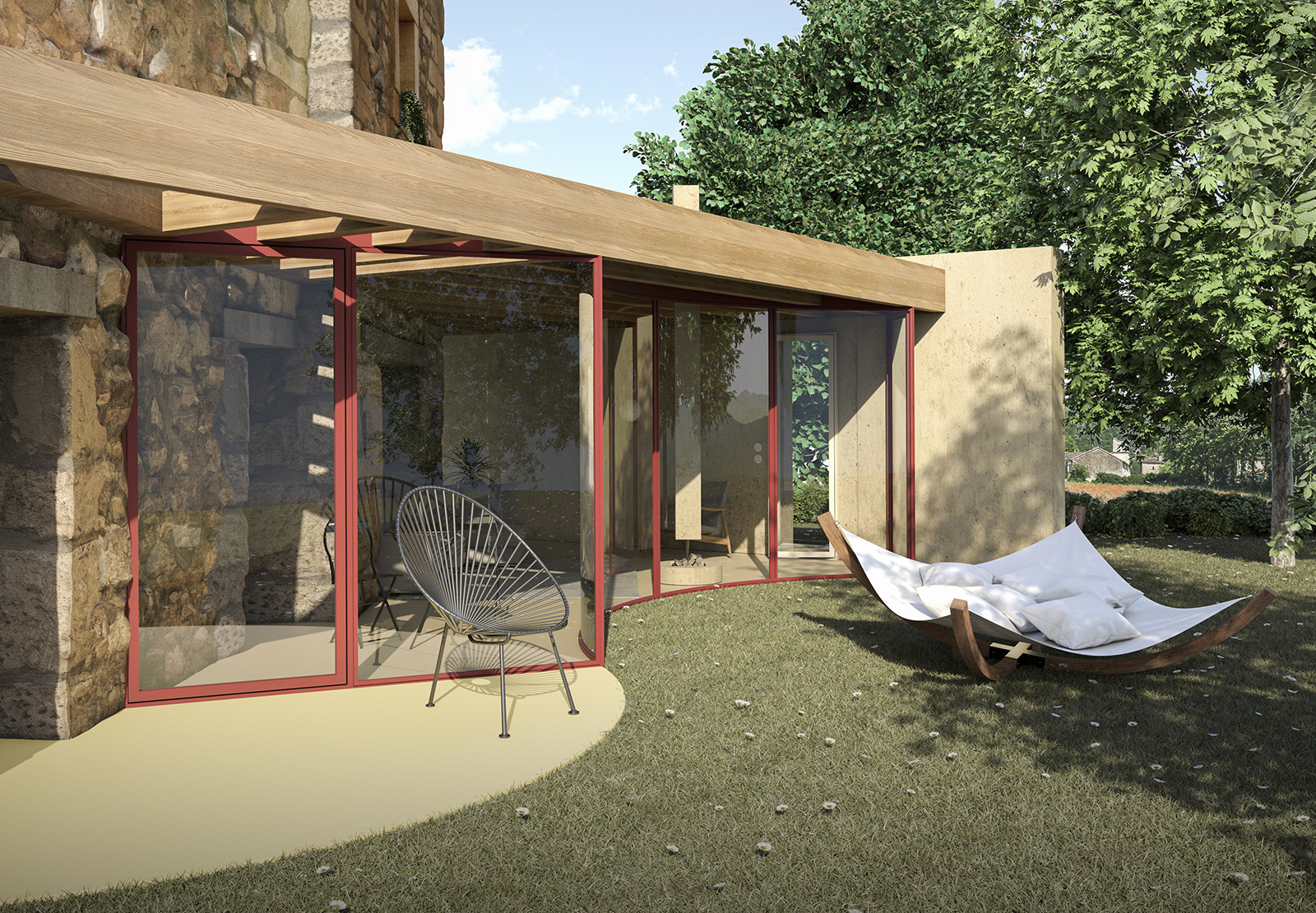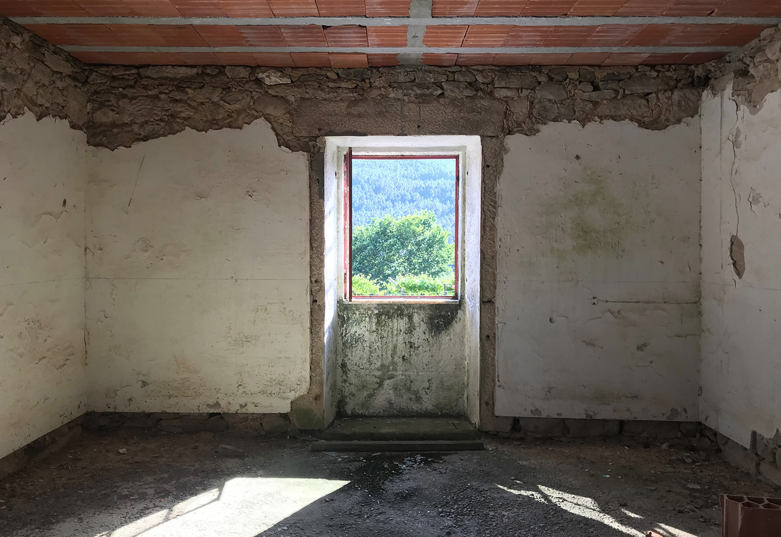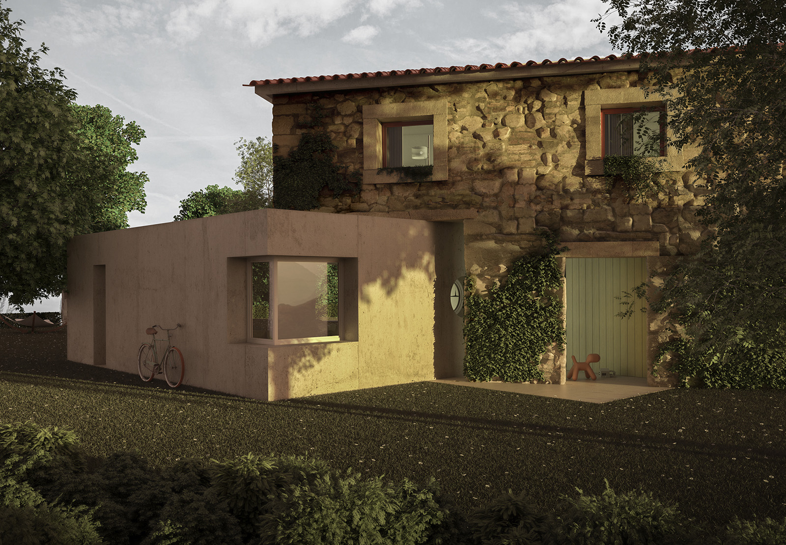 A new room in 90 degrees Dois elementos maciços invadem uma construção existente como catetos, roubam-lhe massa e deixam-na liquidificar na relação com o exterior.