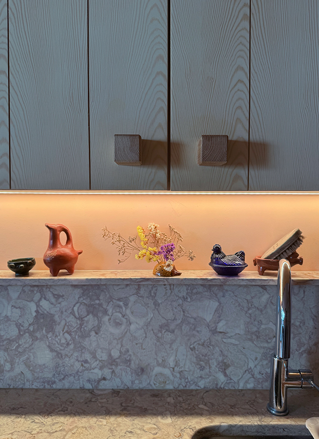 Ouve-se espanhol do México nesta casa com uma influência principal em todos os seus detalhes, desde o mobiliário fixo até à sombra dançante que a luz gera nas paredes cor suave Barragán.